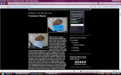 No outro dia… quer dizer, olá caros leitores, no outro dia sucedeu-se eu falar com uns amigos meus que sabem (mas que eu não sabia que sabiam(pelo menos um deles(épá estou a abusar dos parênteses))) da minha inclinação por escrever num blog, ainda por cima nem o faço da melhor maneira, era sempre melhor se eu tivesse piada mas não se podem queixar muito, afinal de contas eu até deixo á vossa disposição fotos que pesam muito no vosso tráfego mas que têm croissants escondidos e até engraçado, para mim, saber que alguns de vocês realmente procuram croissants nas fotos que ponho a vossa disposição (podem mesmo até ver aquele que publiquei hoje, giro não é?), o que me deixa verdadeiramente feliz, faz-me sentir que mudei o mundo, mas voltando ao assunto inicial eu acabei por descobrir 2 coisas, 1, ele já tinha lido pelo menos alguma coisa do blog, 2, que ele tinha descoberto que era eu que escrevia algumas das coisas que apareciam no blog, 3, ele soube do blog por outra pessoa.